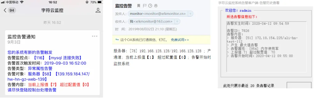 多通道告警:邮件、短信、微信、PC 客户端等,开箱即用