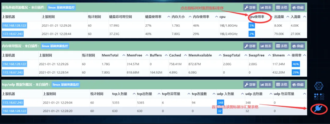 实时表格插件:横向对比分布式集群中各节点指标,支持排序