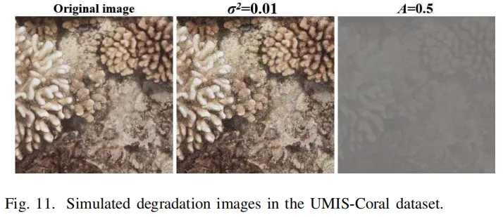 更狠的是鲁棒性实验——作者给图像加了高斯噪声、雾化噪声,模拟水下恶劣环境,结果UMIS-YOLO的性能下降幅度远小于原版YOLOv11m,抗造能力拉满👇