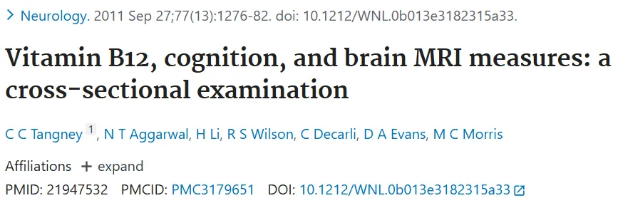 哈佛大学公共卫生学院研究证实,B12缺乏与认知功能下降、脑萎缩风险增加显著相关。