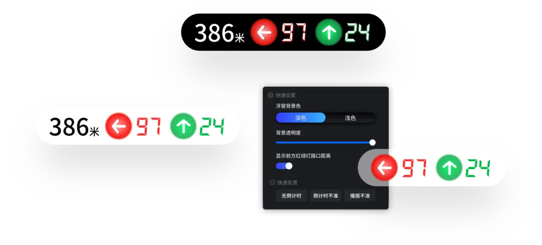 🌅【实测功能展示】实时显示前方红绿灯路口距离(如 386 米),搭配精准倒计时数字,信号灯状态一目了然;快捷设置板块支持自定义浮窗背景色(深色 / 浅色可选)、调节背景透明度,适配不同驾驶视野需求;专属快速反馈通道,可直接上报无倒计时、倒计时不准、播报不准等问题,优化体验更高效;配套详细使用手册,零基础也能快速上手操作。