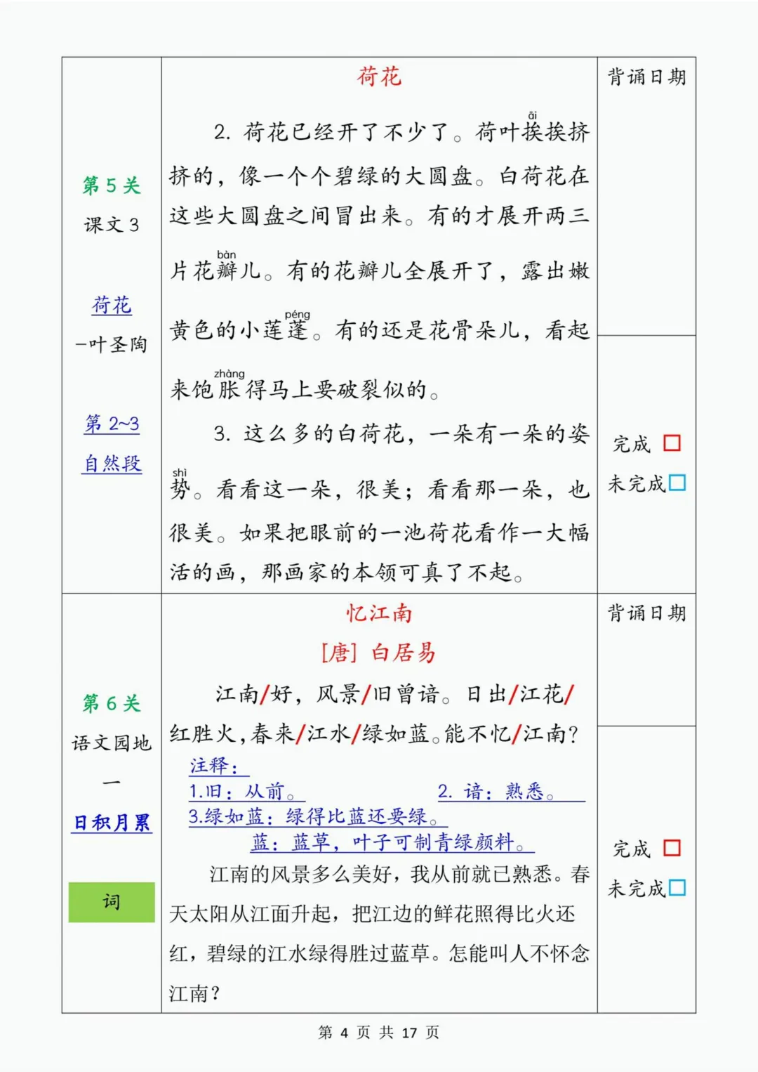 三年级下册语文教材背诵闯关表(电子版可打印)