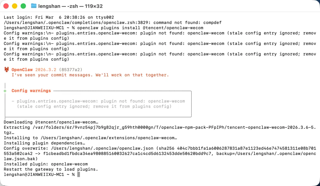 1.以本地部署为例,在本地搜索打开终端,输入以下命令,安装企微插件openclaw plugins install @wecom/wecom-openclaw-plugin2. 安装成功提示如图