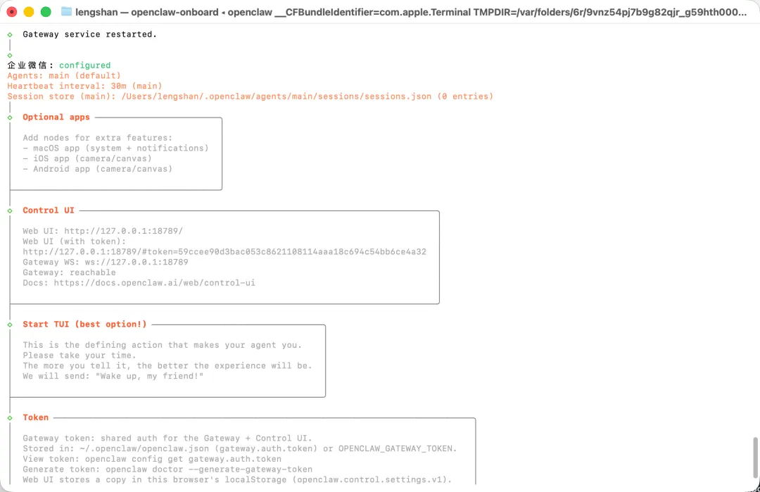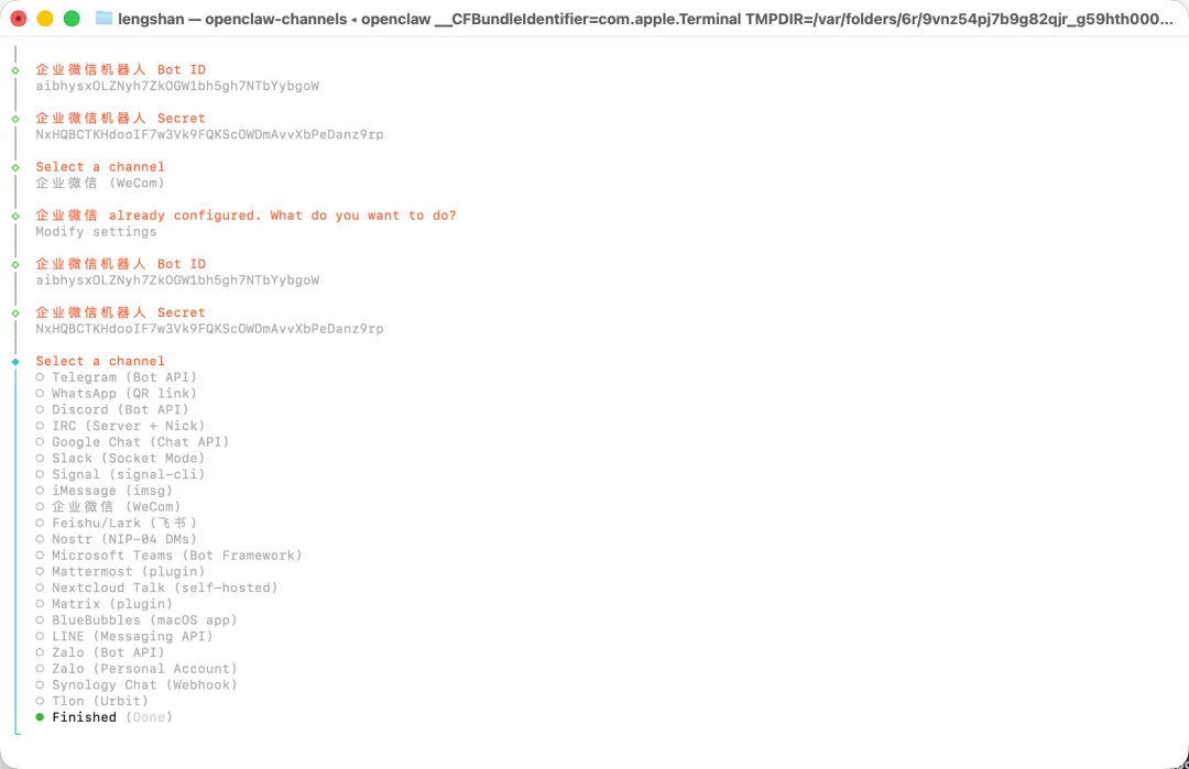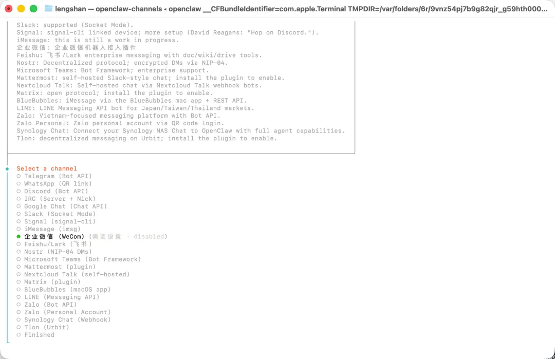 3.重启OpenClawopenclaw gateway start4.在终端中,输入以下命令,添加渠道openclaw channels add5.在「select channel」步骤,选择 channel 为「企业微信」