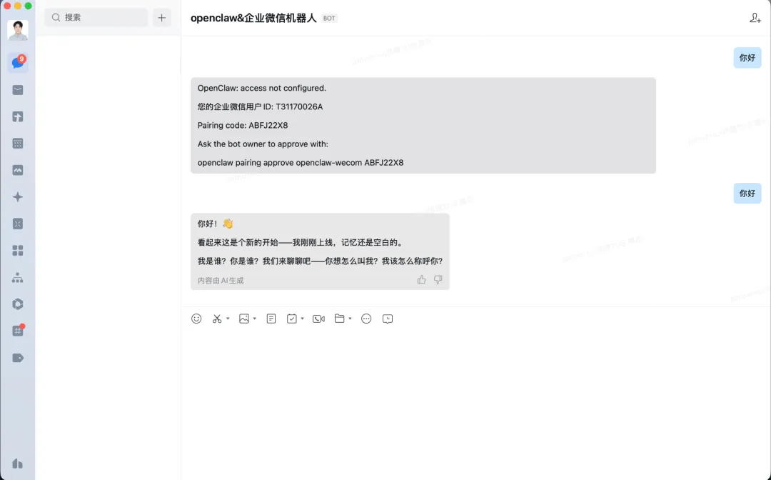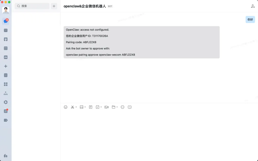 10.在企业微信中,保存机器人,并跟他发消息。会收到一个配置密钥