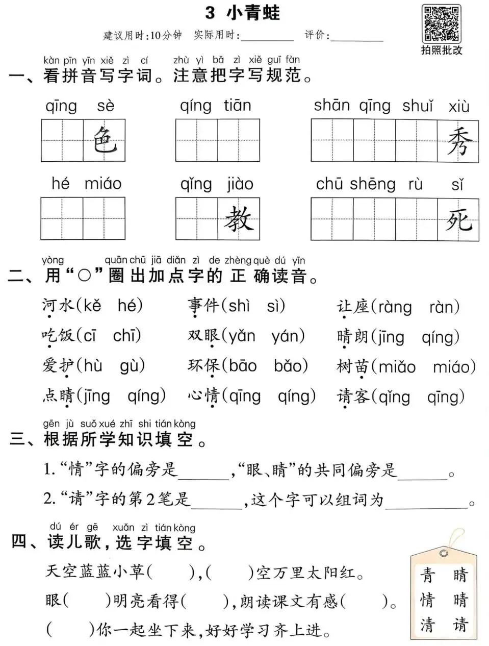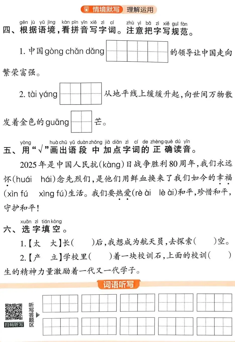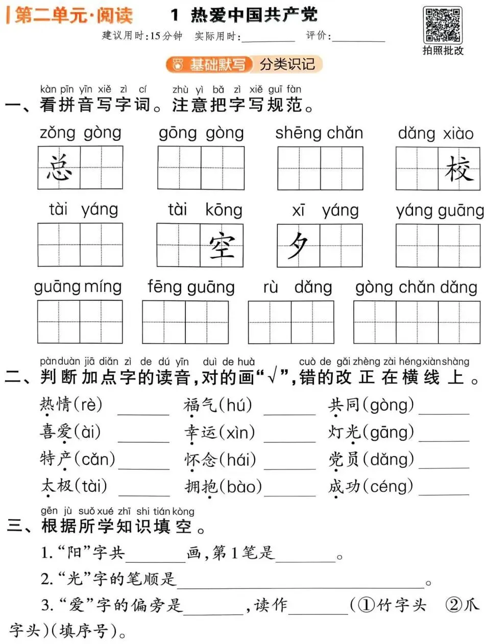 题目基础:内容紧扣课本基础字词,题型较为直接,适合刚起步、需要反复夯实基础的学生。