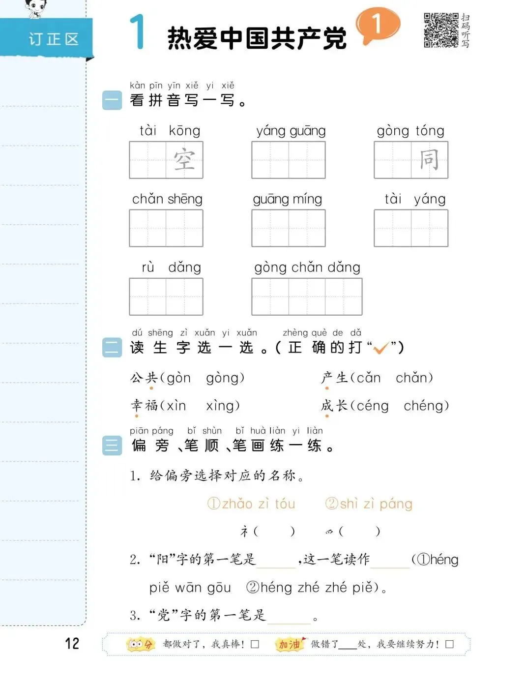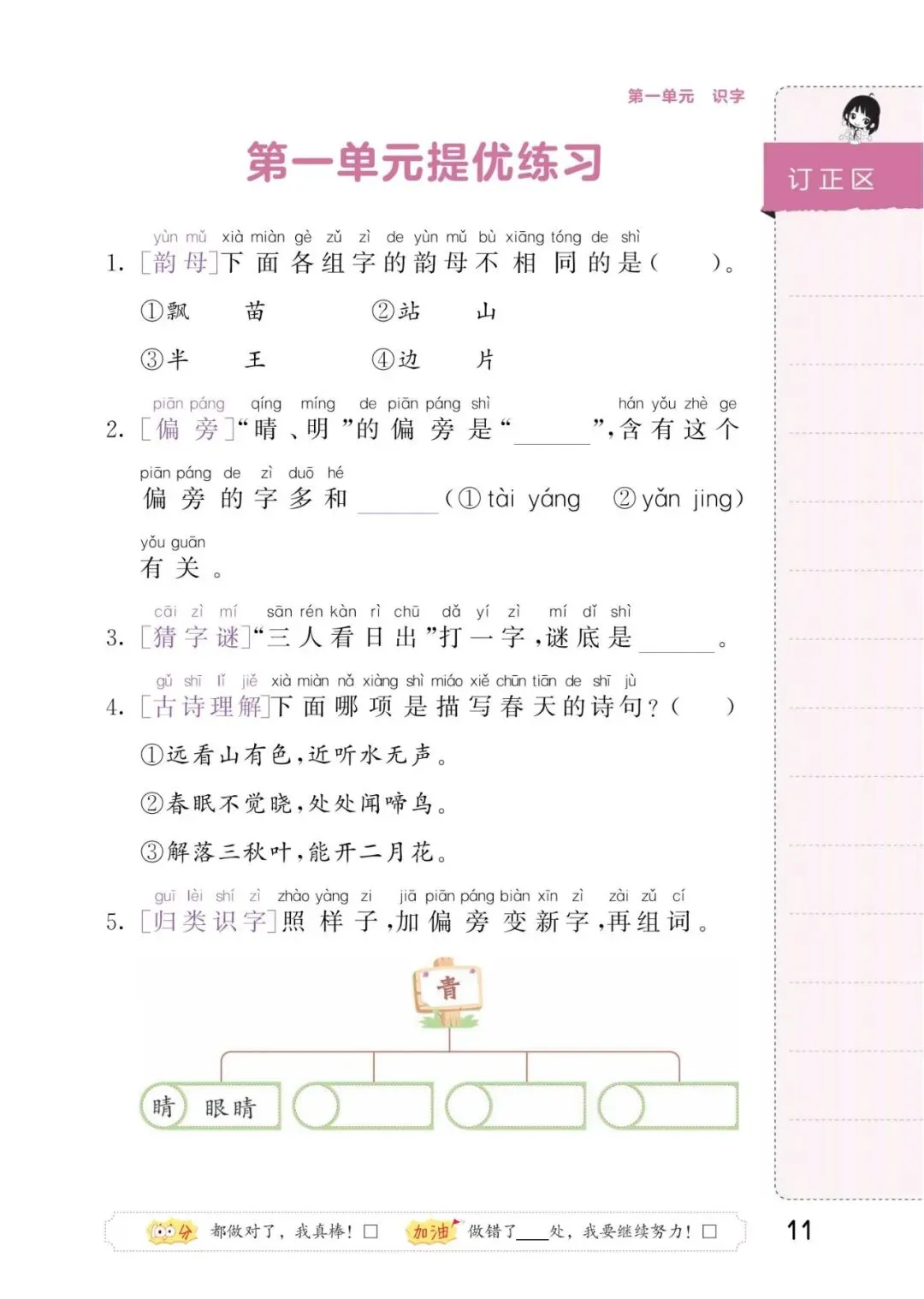 难度稍高:每个单元有提优练习,部分积累和运用题目对一年级学生可能有一定挑战,需要家长或老师从旁指导。