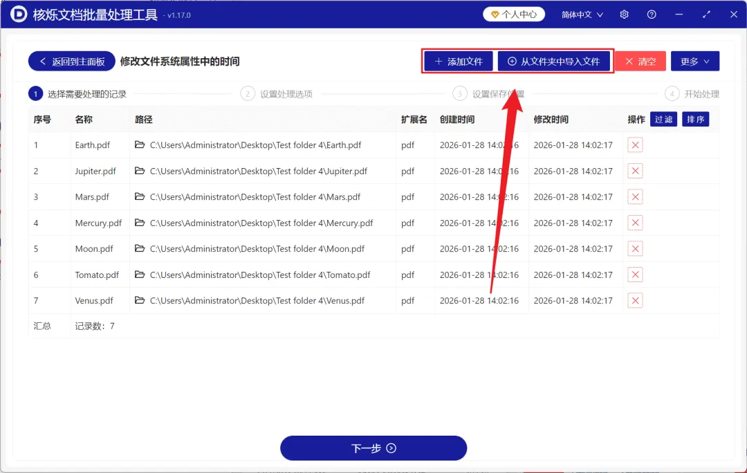 2、在【添加文件】或【从文件夹中导入文件】中选择一个方式将需要修改访问时间的 PDF 添加,也支持将文件直接拖入下方导入,然后点击下一步。