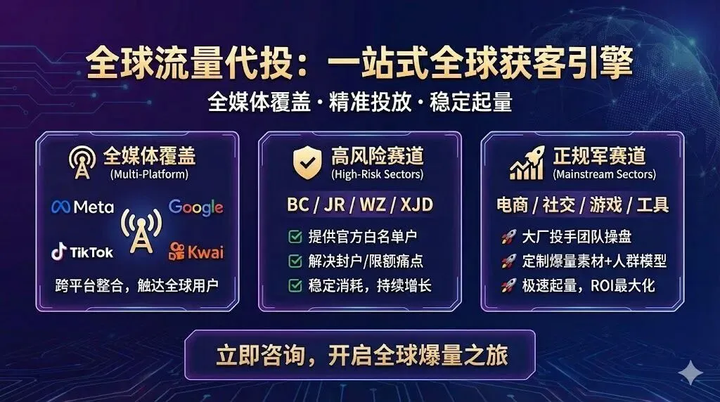 🚀 全媒体高阶代投(支持按效果付费) 深度覆盖 Facebook (Meta), Google, TikTok, Kwai 等全球主流海外媒体。精通本土化高转化素材制作与 AAP/VBO 等进阶自动化竞价模型,为您彻底打透欧美及拉美/东南亚等下沉市场。 合作模式极度灵活:支持常规服务费 (Service Fee) 模式,更支持“按效果付费 (CPA/ROAS 达标对赌)”。 我们敢于与您深度绑定,共同扛起获客成本的压力,只为真实的 ROI 与利润买单。