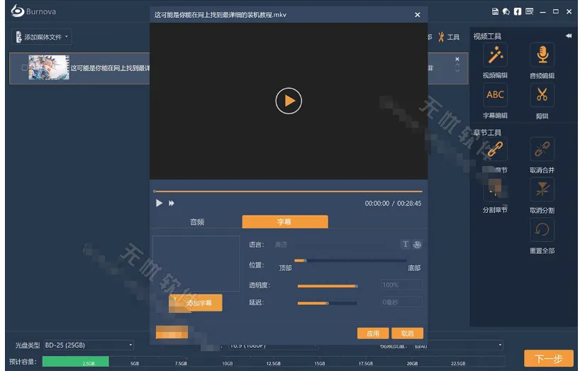 刻录:将各种视频文件刻录为DVD或者Blu-ray光盘。自定义:提供多种模板和菜单样式,可以自定义菜单、背景音乐、字幕和视频效果等。编辑:提供简单的视频编辑工具,可以裁剪、旋转、合并和调整视频效果。创建ISO文件:可以将视频文件合并为ISO映像文件,保存在电脑上以备后续刻录。预览:软件内置了媒体播放器,可以在刻录之前预览视频效果。