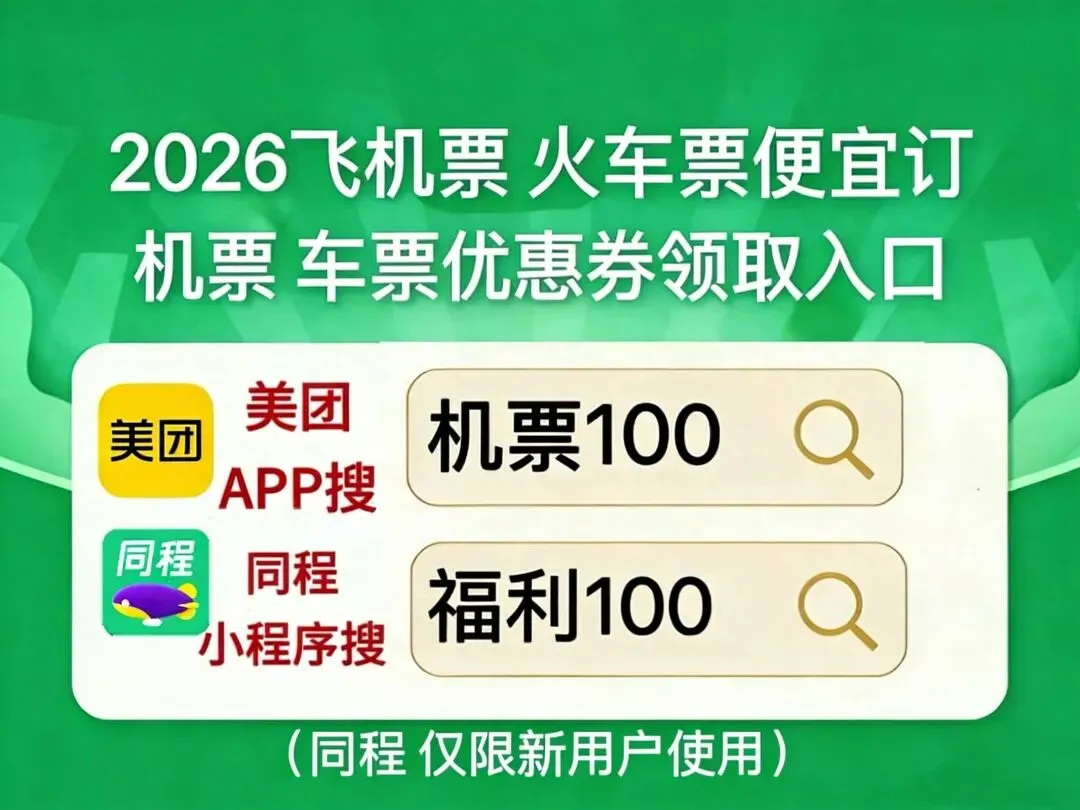 美团APP搜【机票100】同程搜【福利100】低价订机票。2026机票高铁购票攻略:哪个APP订机票便宜?出行机票怎么订便宜?特价机票怎么订?直接去美团APP搜【机票100】同程搜【福利100】领特惠券包,便宜订机票车票啦!
