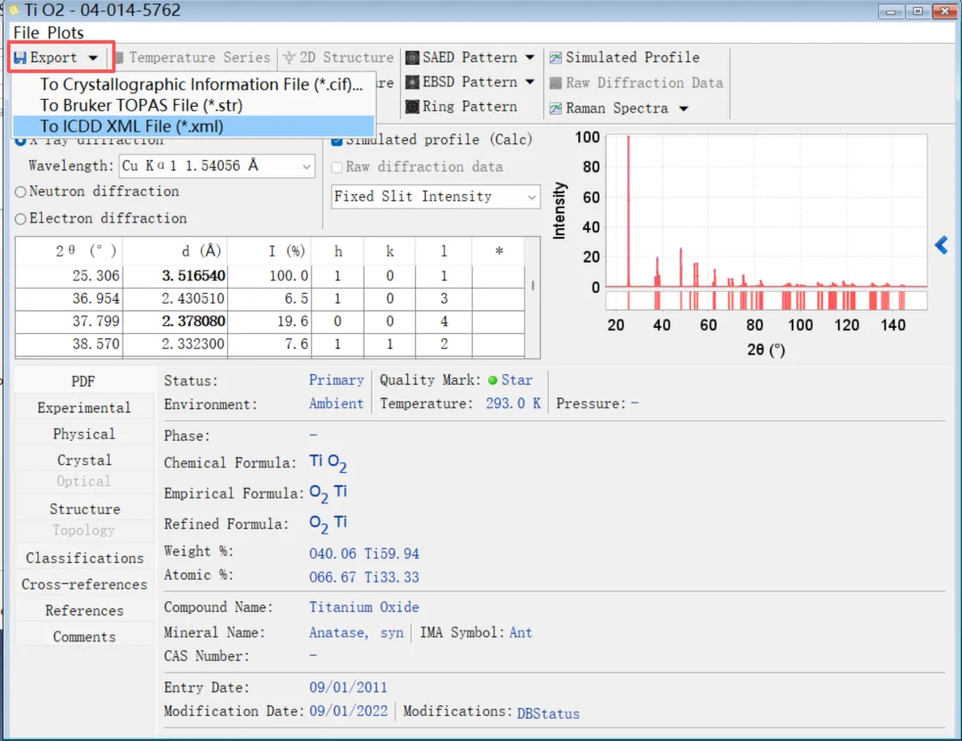 PDF卡片中可以提供保存cif或str两种类型的晶体结构文件,其格式路径:点击单张PDF卡片界面左上角 Export按钮,在其下拉菜单中选择“to Crystallographic Information File(*cif) 或 To Bruker TOPAS File (*.str)” 选项,然后选择指定的文件夹保存即可,所保存的*cif格式为晶体结构数据的通用格式,可使用常规的粉末XRD数据处理分析软件直接打开,如JADE、Highscore plus、VESTA、Fullprof等软件。