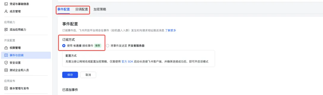 2. 选择「使用长连接接收事件(WebSocket 模式)」 -