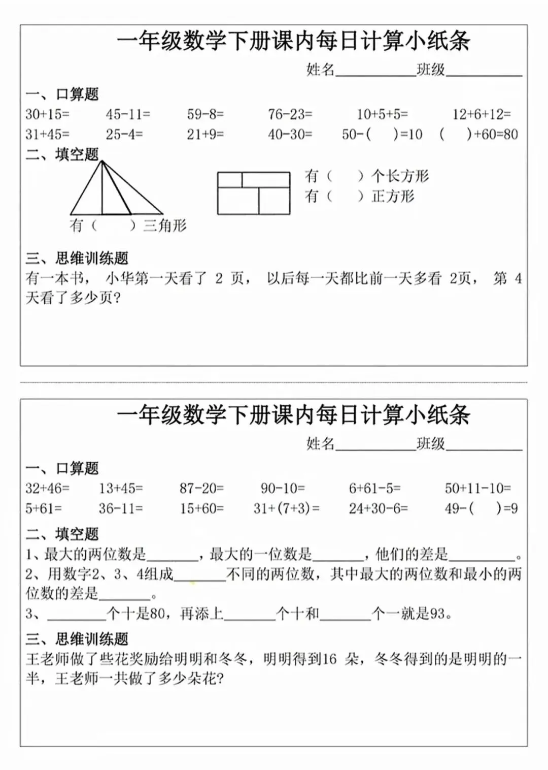 数学1-6年级(下册)《每日计算小纸条》可打印