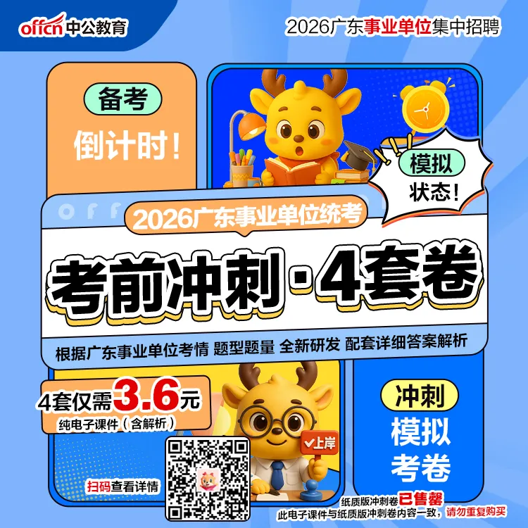 电子版!广东事业单位统考 考前冲刺4套卷 广东事业单位统考 考前冲刺4套卷【电子版】 含有试卷和答案解析,仅需3.6元 💣此电子课件与纸质版冲刺卷内容一致,请勿重复购买 广东事业单位统考备考进行时 扫码购买学习