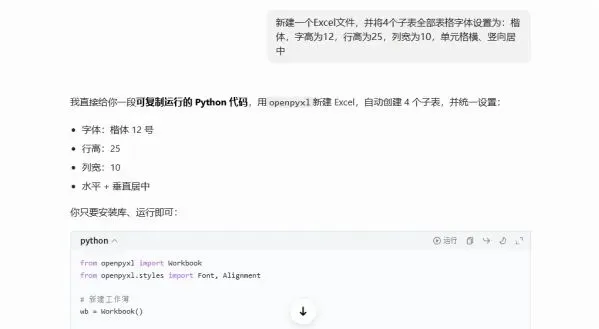 打开豆包软件,输入提示词:新建一个Excel文件,并将4个子表全部表格字体设置为:楷体,字高为12,行高为25,列宽为10,单元格横、竖向居中