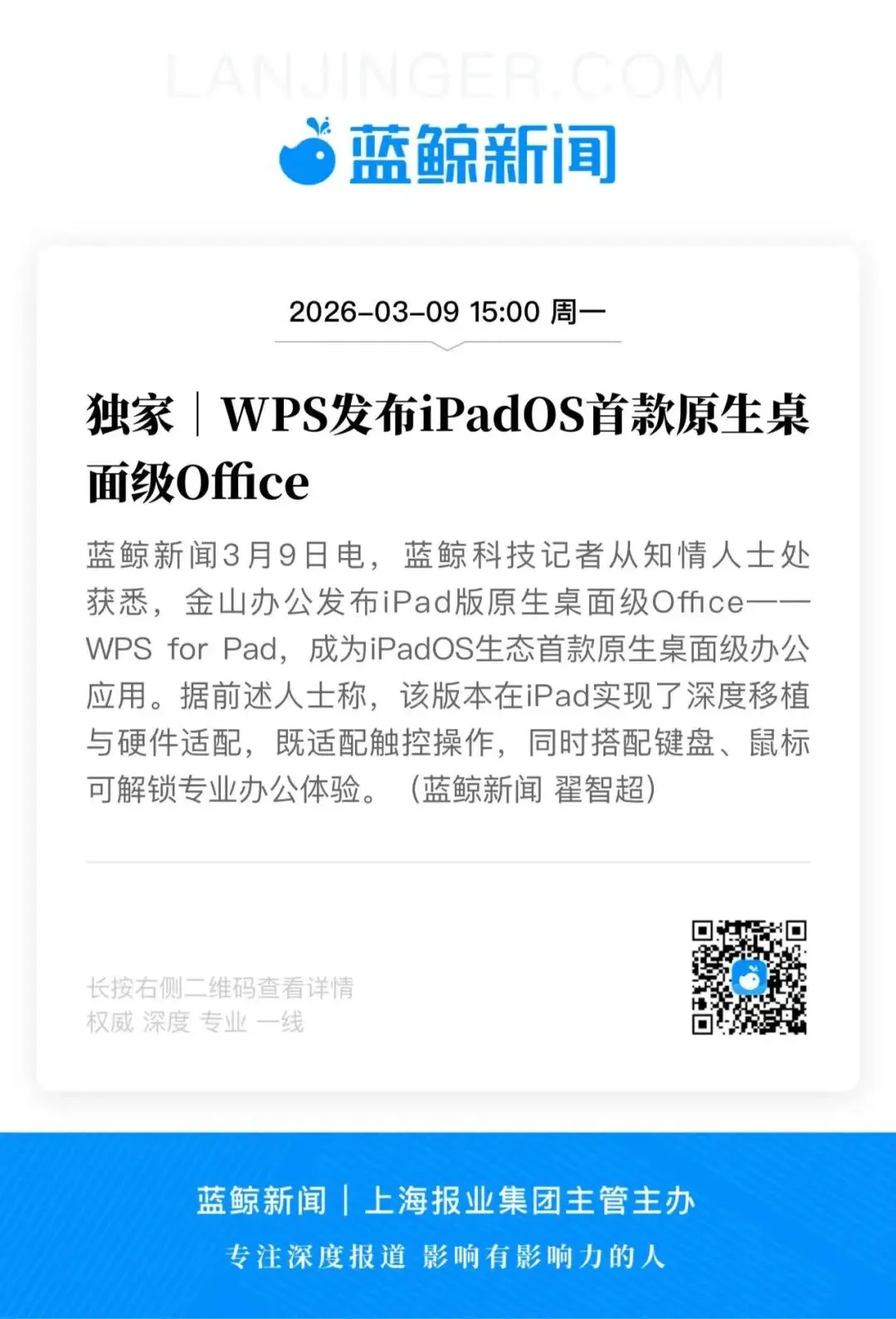 蓝鲸新闻3月9日电,蓝鲸科技记者从知情人士处获悉,金山办公发布iPad版原生桌面级Office——WPS for Pad,成为iPadOS生态首款原生桌面级办公应用。据前述人士称,该版本在iPad实现了深度移植与硬件适配,既适配触控操作,同时搭配键盘、鼠标可解锁专业办公体验。(蓝鲸新闻 翟智超)