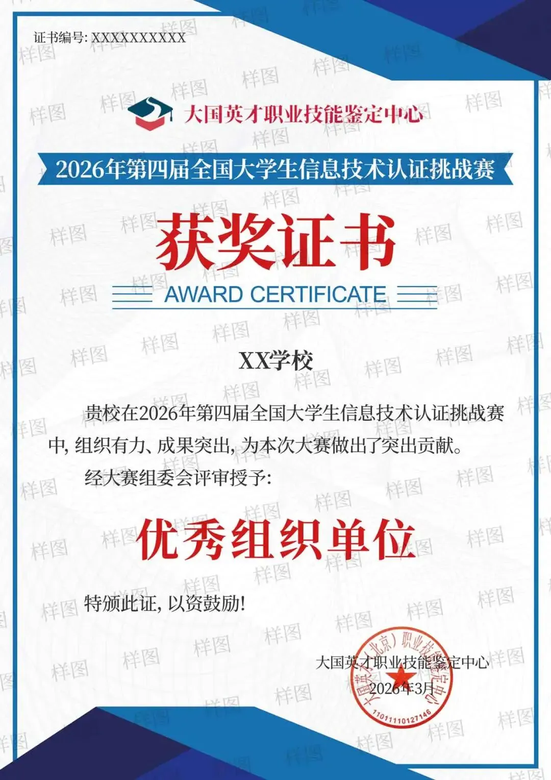 根据指导报名大赛的学生人数且学生获奖人数进行综合评定,评定合格的单位,颁发优秀组织单位称号。