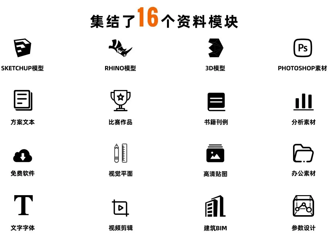 涵盖:SU模型库、PS素材库、3d模型库、方案文本库、资料库等.超过:100w+ 的优质素材 + 课程