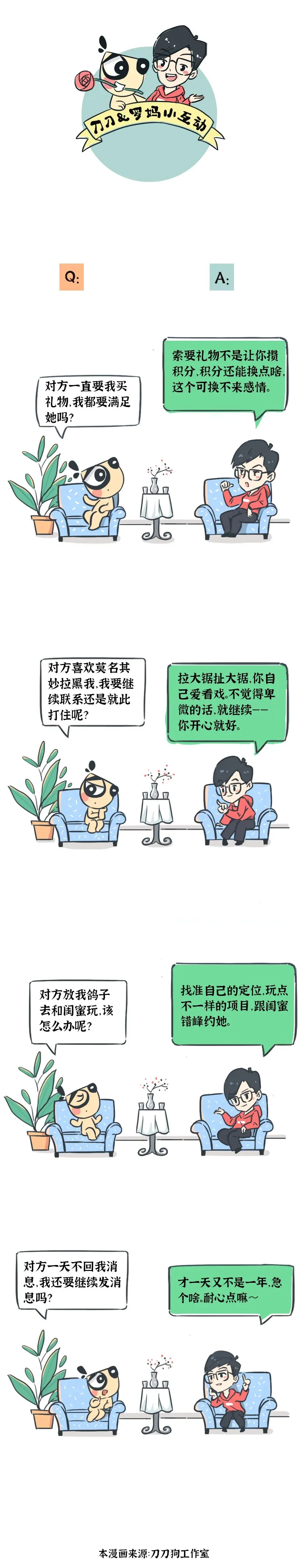 为了更好的感受情感的流转,罗妈特意邀请了著名动漫IP形象刀刀狗,开启罗妈&刀刀《爱情小互动》漫画栏目,一起来看看吧~