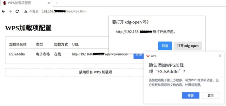 点击下图的“安装”–点击“信任并安装”会弹出确认窗口, 同时会有一个 xdg-open的对话框,这个是浏览器调用wps的提示框,点击【打开 xdg-open】,点击【安装】。
