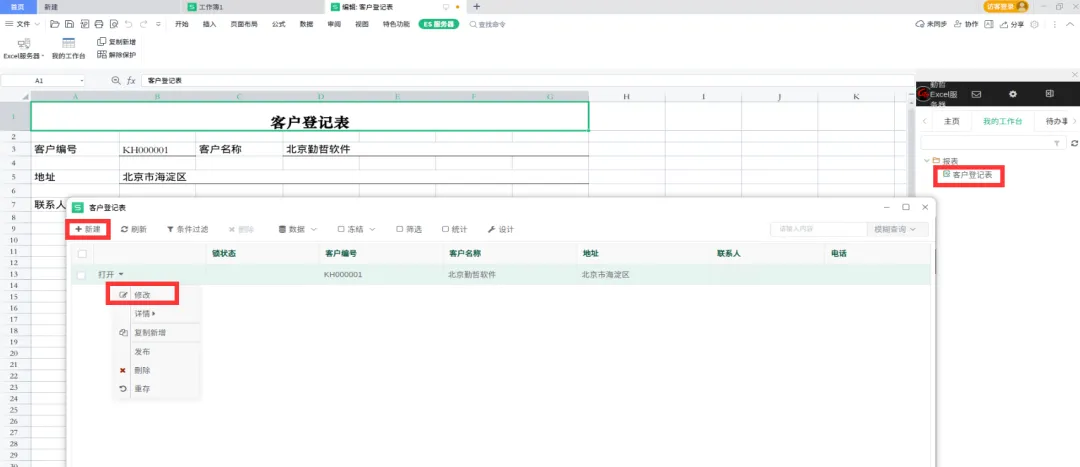 填报表单时,可以点击工作台的相关模版名称,在打开的页面里,点击新建来新建表单,或者点击修改修改表单,或者点击打开查看表单,然后会弹出wps表格的表单窗口,通过wps表格进行相关的操作。