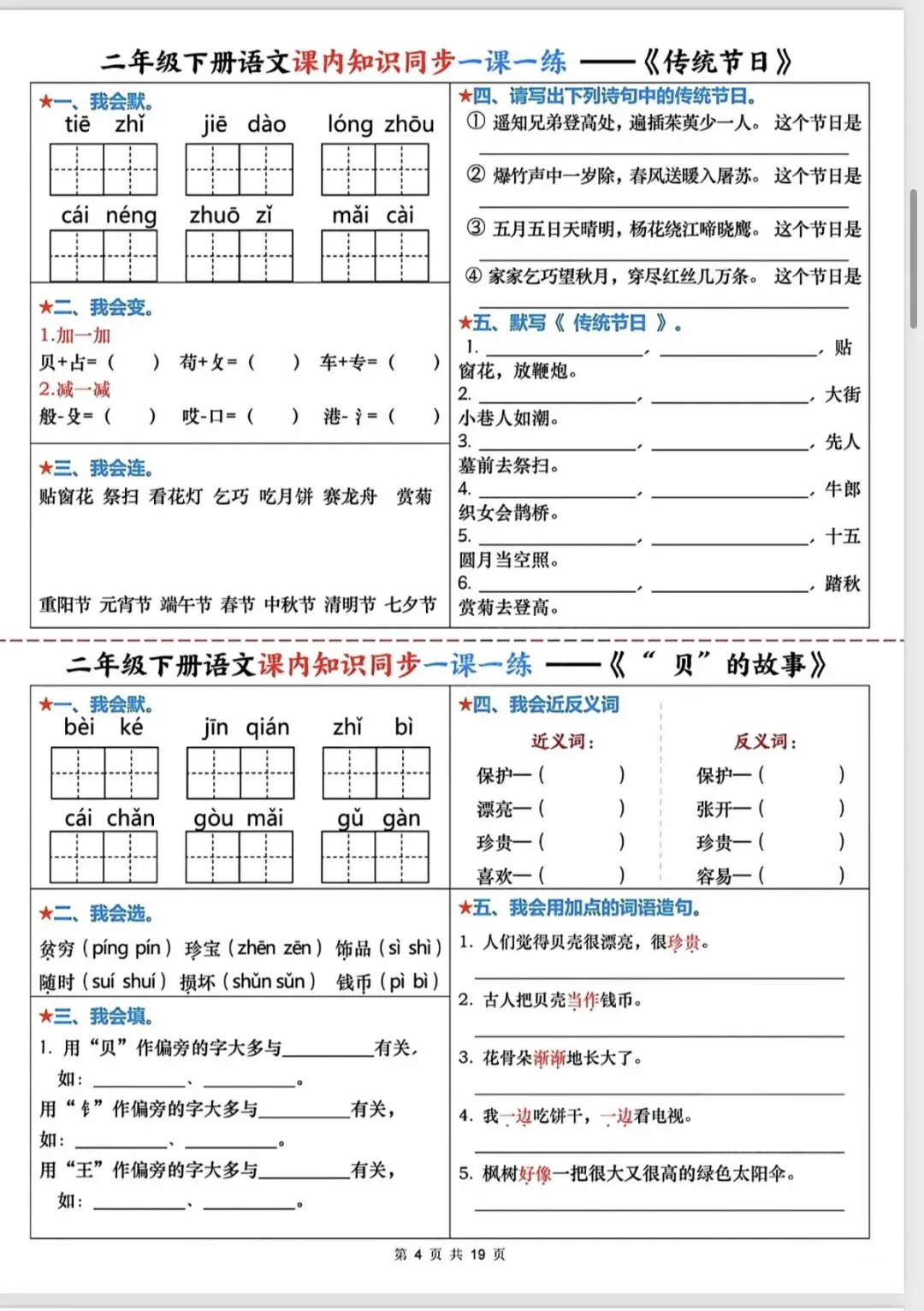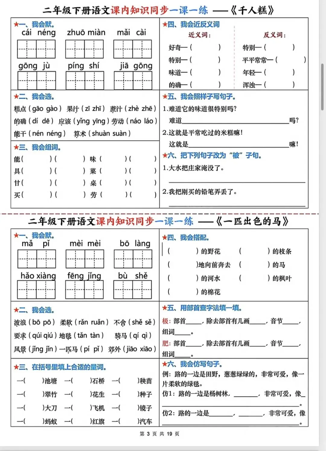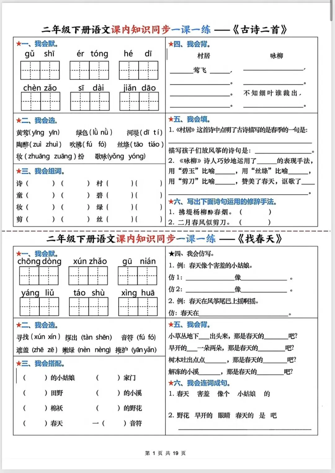 二年级语文课内知识同步一课一练(完整版可打印)