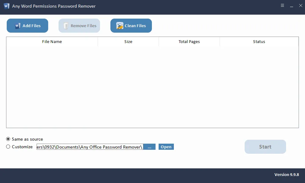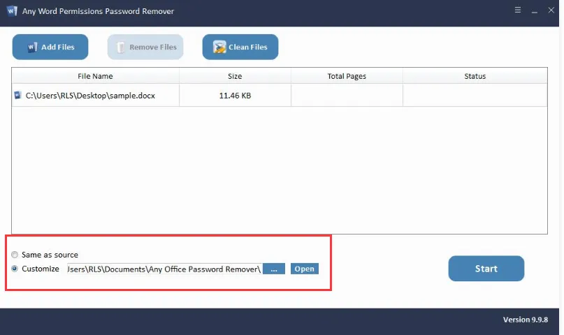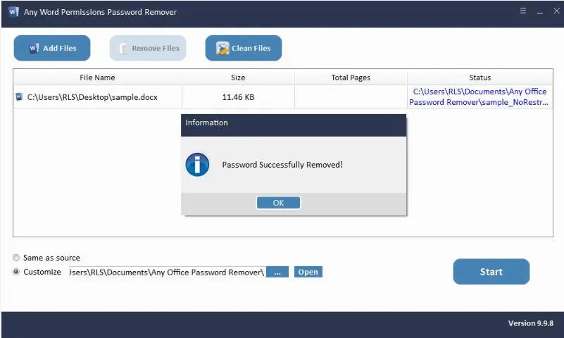 点击start开始,几秒钟内就会删除word密码,并将新的文件保存在你设置的目录中
