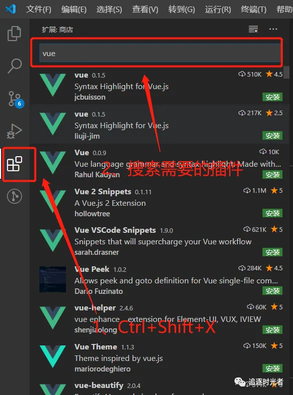 快捷键:Ctrl+Shift+X进入拓展面板,到应用商店文本框中搜索拓展。