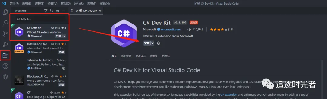 打开VS Code=>找到拓展(Ctrl+Shift+x)=>搜索C# Dev Kit=>点击安装