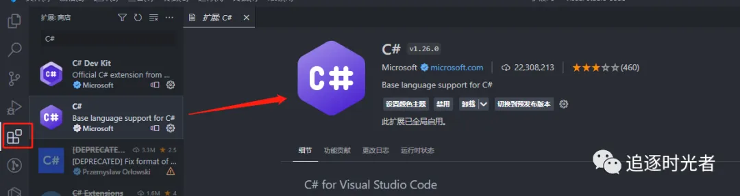 打开VS Code=>找到拓展(Ctrl+Shift+x)=>搜索C#=>点击安装