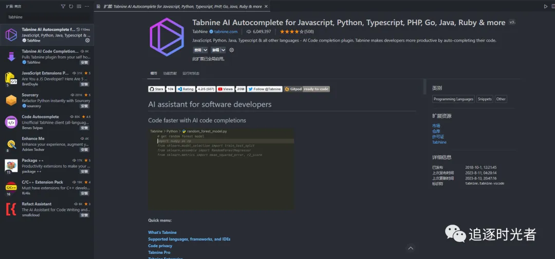 插件市场地址:https://marketplace.visualstudio.com/items?itemName=TabNine.tabnine-vscode