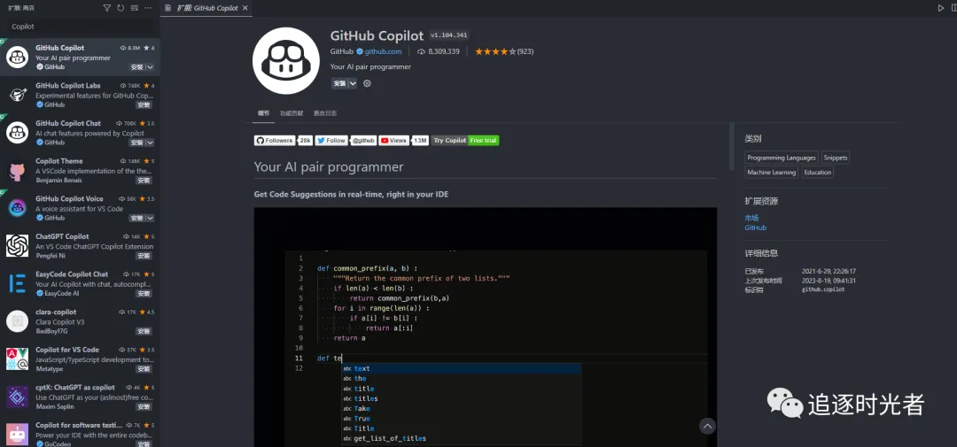 插件市场地址:https://marketplace.visualstudio.com/items?itemName=GitHub.copilot