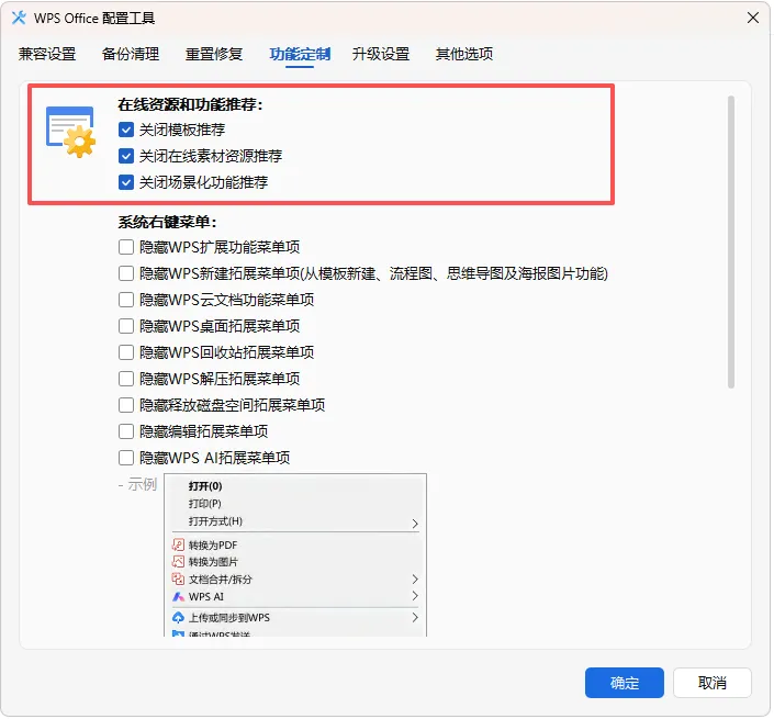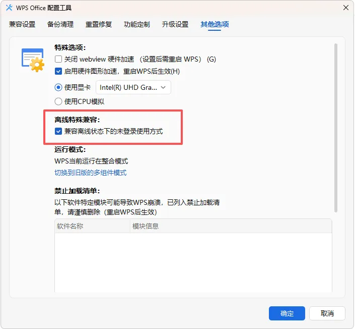 然后在”其他选项”中,勾选”兼容离线状态下的未登录使用方式”选项,点击”确定”按钮保存设置并退出”配置和修复工具”。