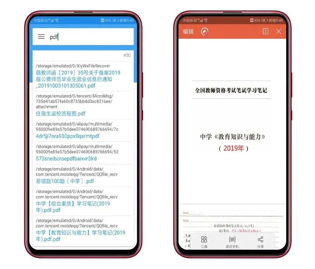 搜索一个PDF文件,软件会自动显示手机里全部符合条件的内容;