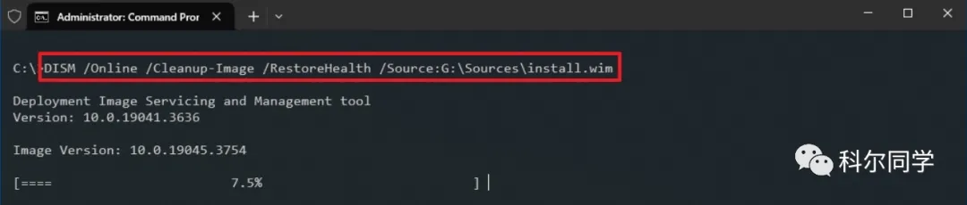 完成这些步骤后,继续使用 DISM 工具,使用“源”选项修复本地映像。