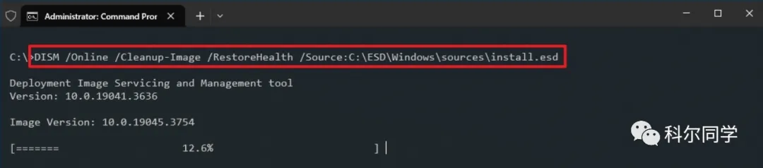 完成这些步骤后,该工具将使用“install.esd”映像中包含的文件修复损坏的文件。