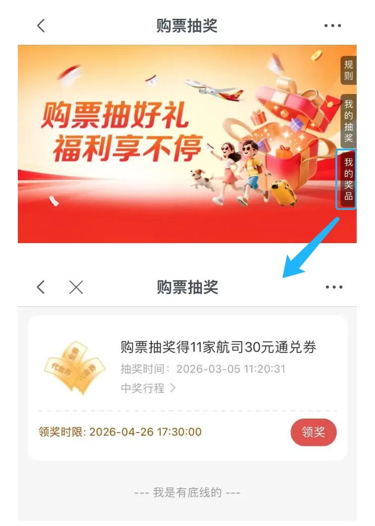 自中奖人完成中奖客票实际乘机之日起30日内,中奖人需登录“海南航空”APP,进入活动页面点击右上角“我的奖品”进行中奖信息查询及奖品领取。