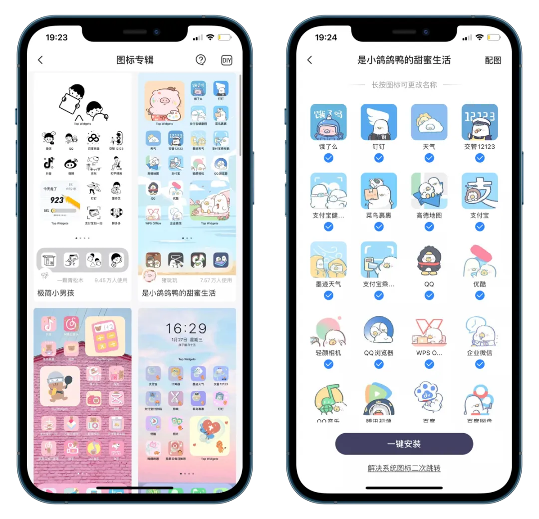 图标专辑页挑选自己喜欢的图标&主题,根据提示一键安装描述文件,返回桌面就可以看到全新的 APP 图标。再把重复图标隐藏或是放进文件夹,就能拥有好看的图标了。