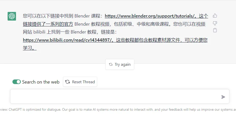 1. 我希望他向我提供 Blender 教程的链接(可能因为中文原因提供的竟含有 B 站链接):
