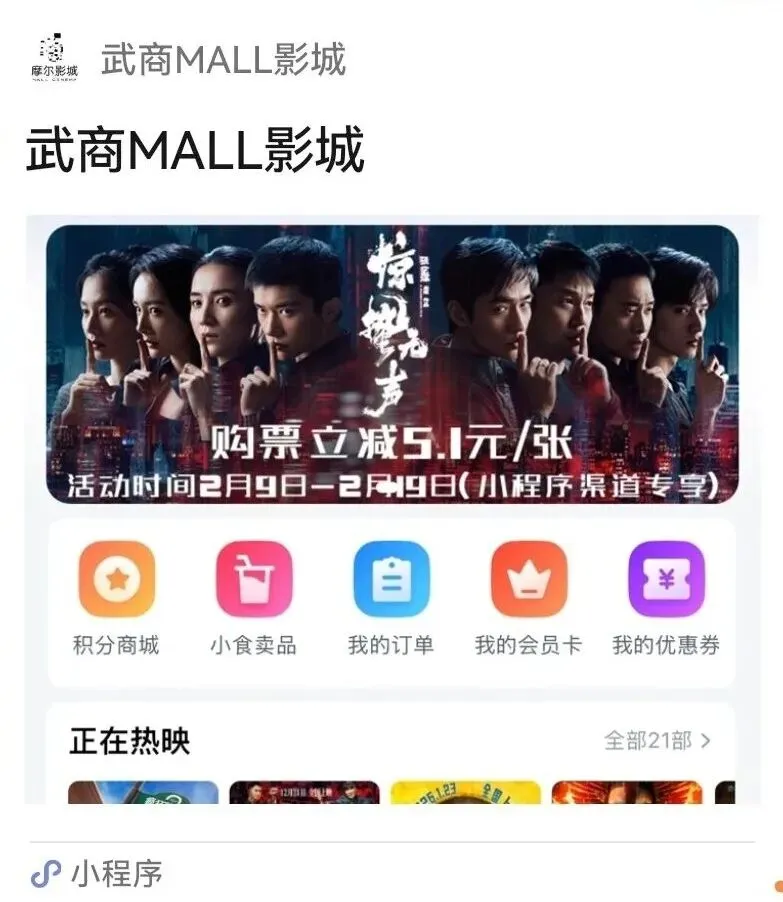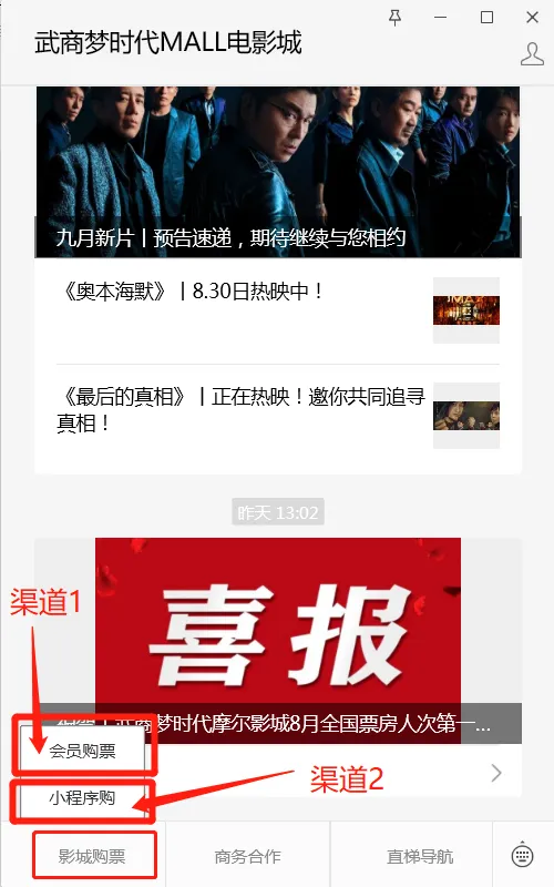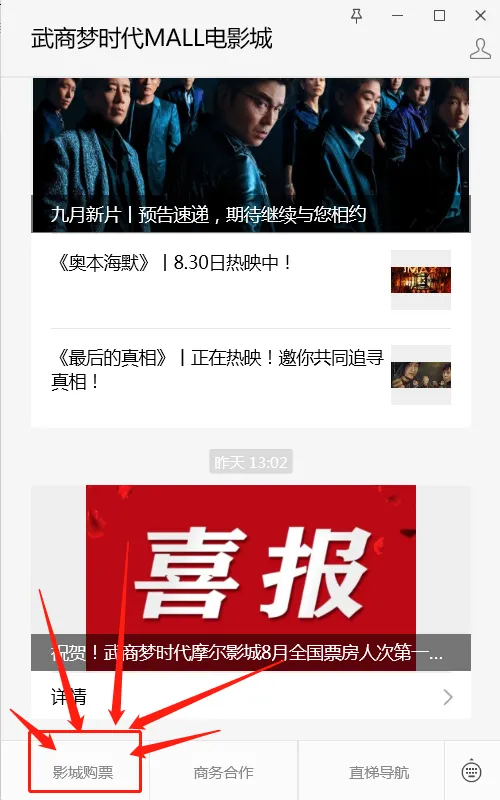 请在官方唯一公众号“武商梦时代MALL电影城”左下角菜单栏进入,其他任何公众号或小程序都是假冒。有问题请及时电联027-87780088.
