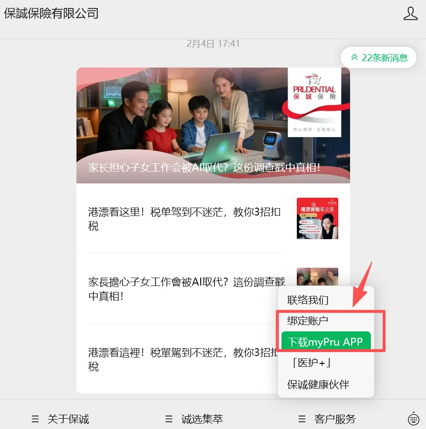 – 此外,保诚也有微信服务号,也可以直接绑定账户信息,查询保单信息!