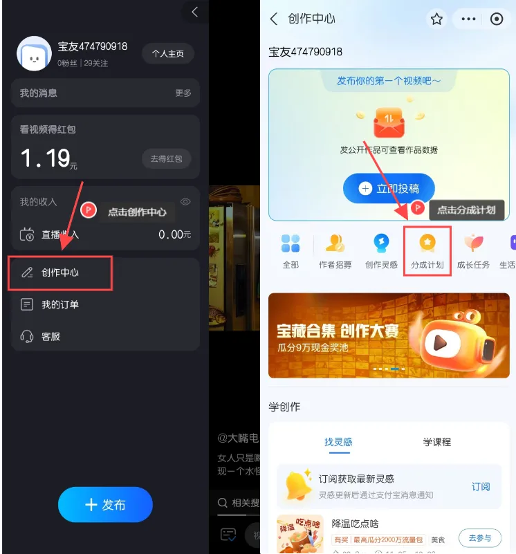 开通创作者分成计划,发视频的时候声明原创,平台就会在你的视频里植入广告,有播放就有收益,收益直接到微信钱包,秒到账,太方便了。