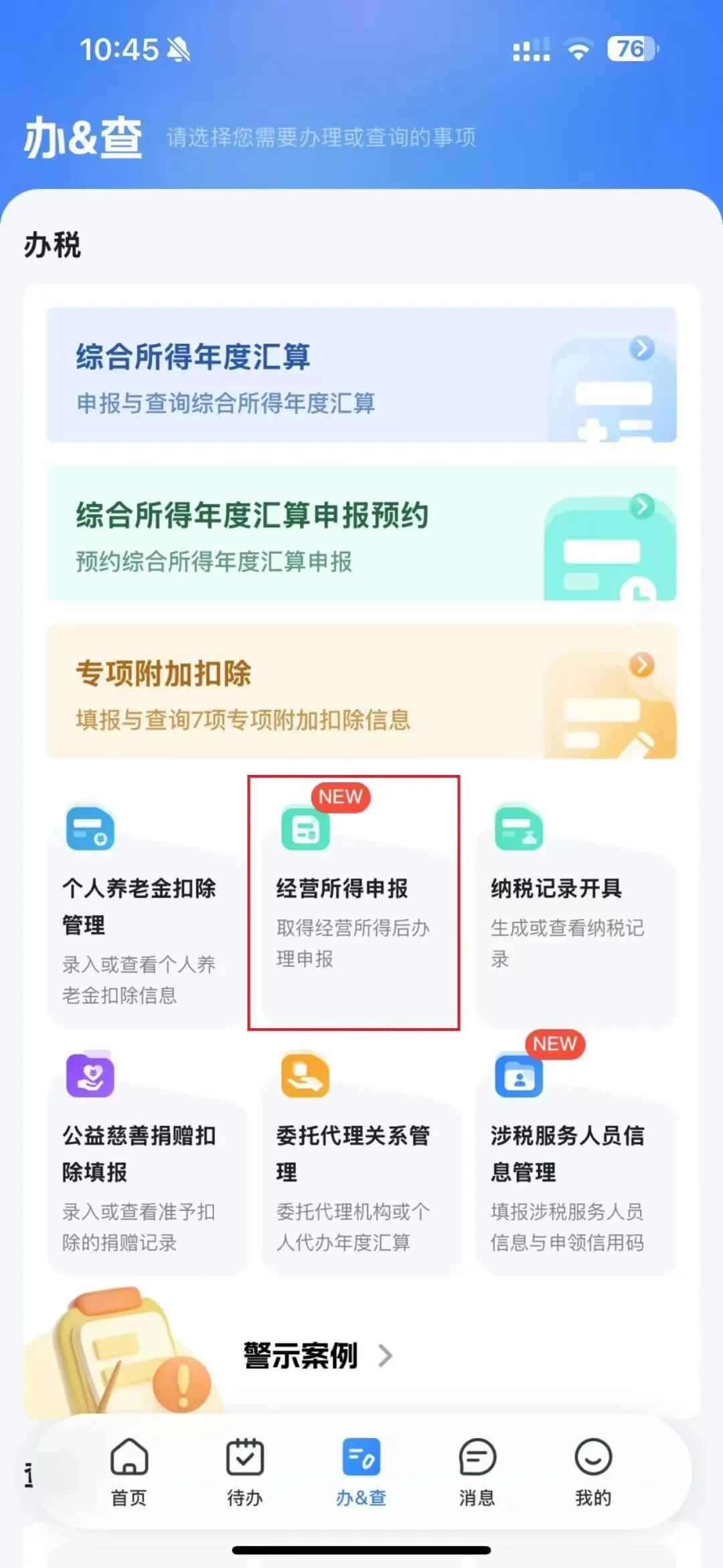 打开手机个人所得税APP,登录成功后点击下方【办&查】,点击【经营所得申报】;
