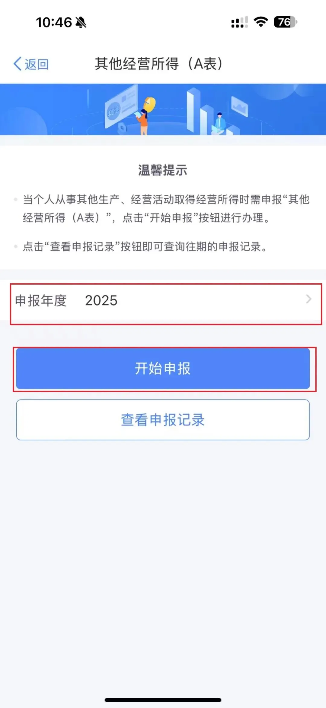 进入【其他经营所得(A表)】界面,选择需要申报的年度,点击“开始申报”进入申报环节;