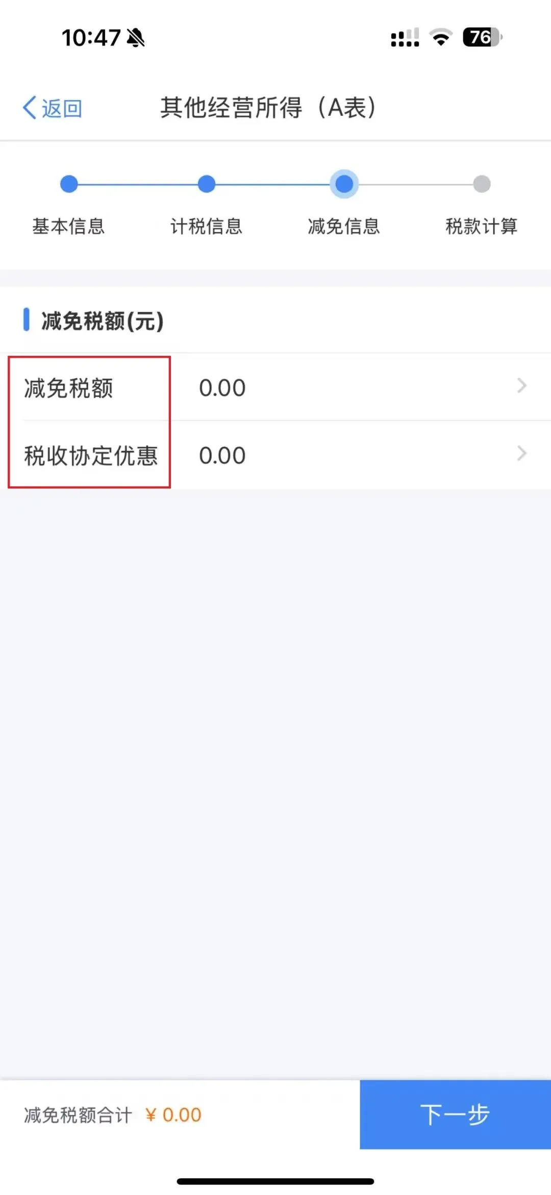 选择【税款所属期止】(月末或季度末均可)和【经常居住地】,选择完毕后点击下一步。