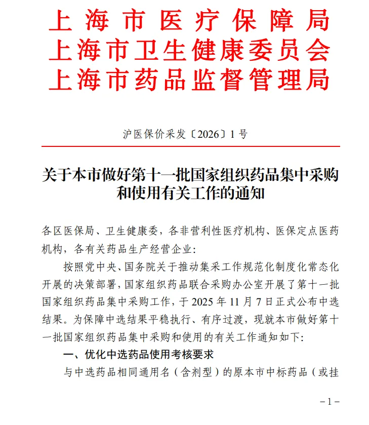 按照党中央、国务院关于推动集采工作规范化制度化常态化开展的决策部署,国家组织药品联合采购办公室开展了第十一批国家组织药品集中采购工作,于2025年11月7日正式公布中选结果。为保障中选结果平稳执行、有序过渡,现就本市做好第十一批国家组织药品集中采购和使用的有关工作通知如下: