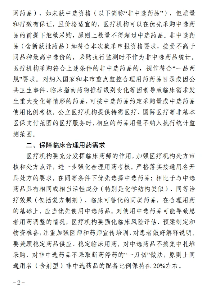 与中选药品相同通用名(含剂型)的原本市中标药品(或挂网药品),如未获中选资格(以下简称“非中选药品”),但质量和疗效有保证,且价格适宜的,医疗机构可以在优先采购中选药品的前提下继续采购,原则上数量不得超过中选药品。非中选药品(含新获批药品)如符合本次集采申报资格要求,接受不高于同品种最高中选价的,采购执行监测时不作为非中选药品统计。医疗机构采购符合上述条件的非中选药品的,视作符合“一品两规”要求。对纳入国家和本市重点监控合理用药药品目录或因公共卫生事件、临床指南药物推荐级别变化等因素导致临床需求发生重大变化等情形的药品,可按中选药品约定采购量或中选药品使用比例考核。公立医疗机构提供特需医疗、国际医疗等非基本医保支付范围的医疗服务时,相应的药品用量不纳入执行统计监测范围。