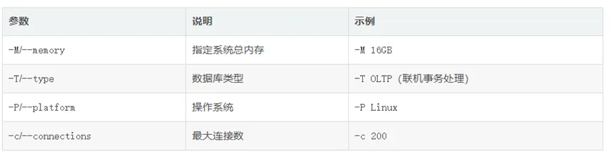 -T or –type : 指定数据库类型. 可选的类型为: DW, OLTP, Web, Mixed, Desktop.