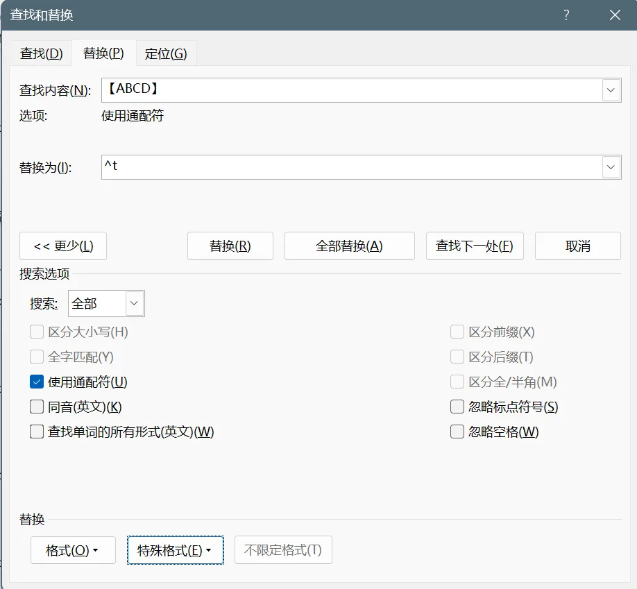 接着将光标定位到“替换为”,点击“更多”,勾选“使用通配符”,然后在“特殊格式”中选择“制表符”。